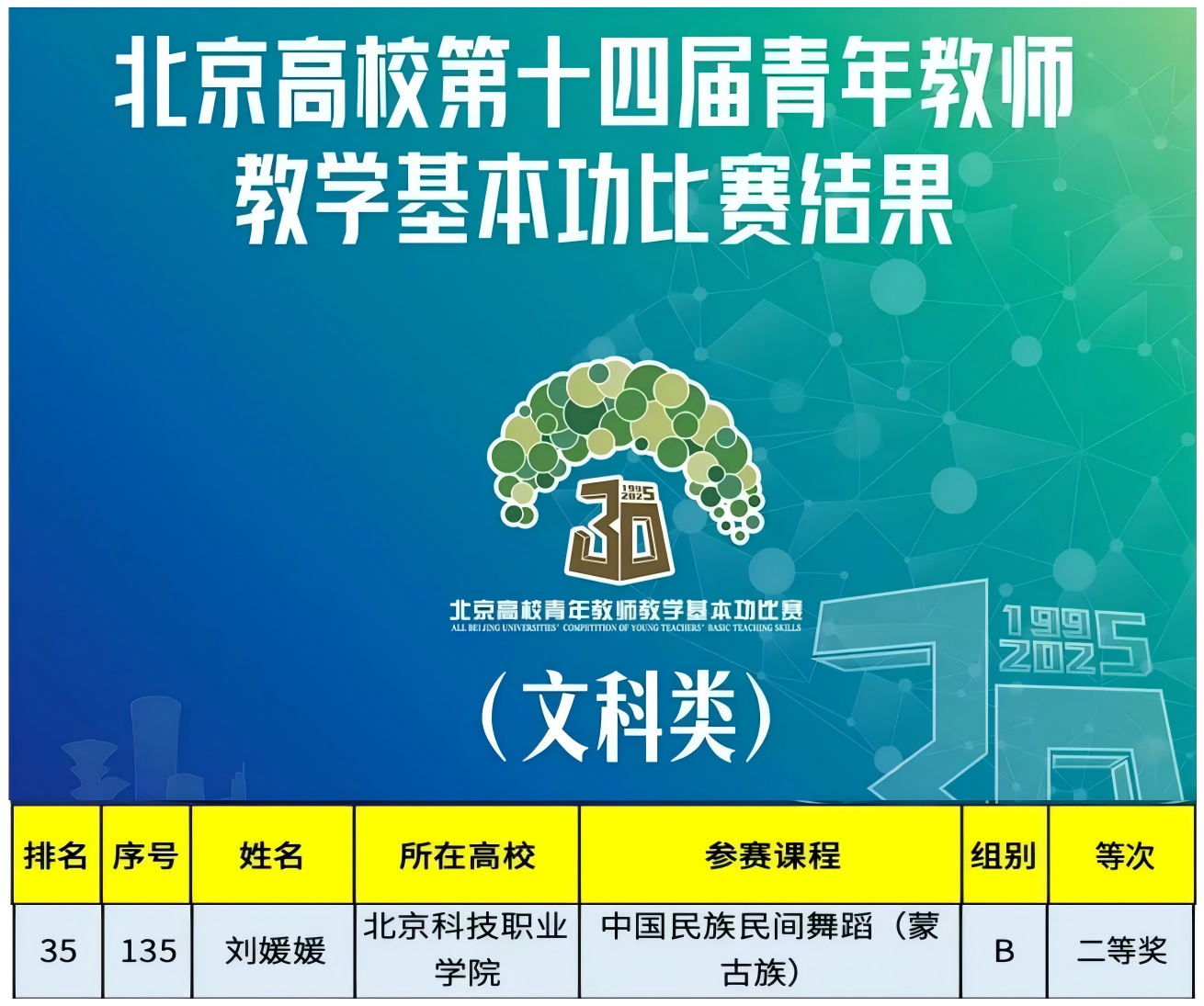 近日,备受瞩目的北京高校第十四届青年教师教学基本功比赛(以下简称“青教赛”)落下帷幕。在这场代表首都高校青年教师教学最高水平的竞技场上,北京科技职业学院教育学院青年教师刘媛媛凭借扎实的教学功底、创新的教学设计及精彩的现场表现,在与众多本科院校优秀教师的激烈角逐中脱颖而出,教授的《中国民族民间舞蹈(蒙古族)》课程荣获文科类B组二等奖。这是我校教师在参加该赛事以来所取得的最好成绩,实现了新的突破,生动展现了学校在青年教师队伍建设和教学质量提升方面取得的显著成效。