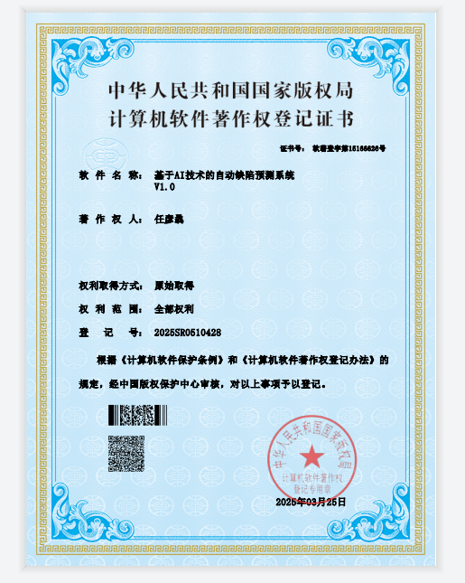 2025年3月,北京科技职业学院人工智能与网络安全应用学院2023级软件技术专业任彦骉同学主持研发的“基于AI技术的自动缺陷预测系统V1.0”获国家版权局计算机软件著作权登记(登记号:2025SR0510428)。